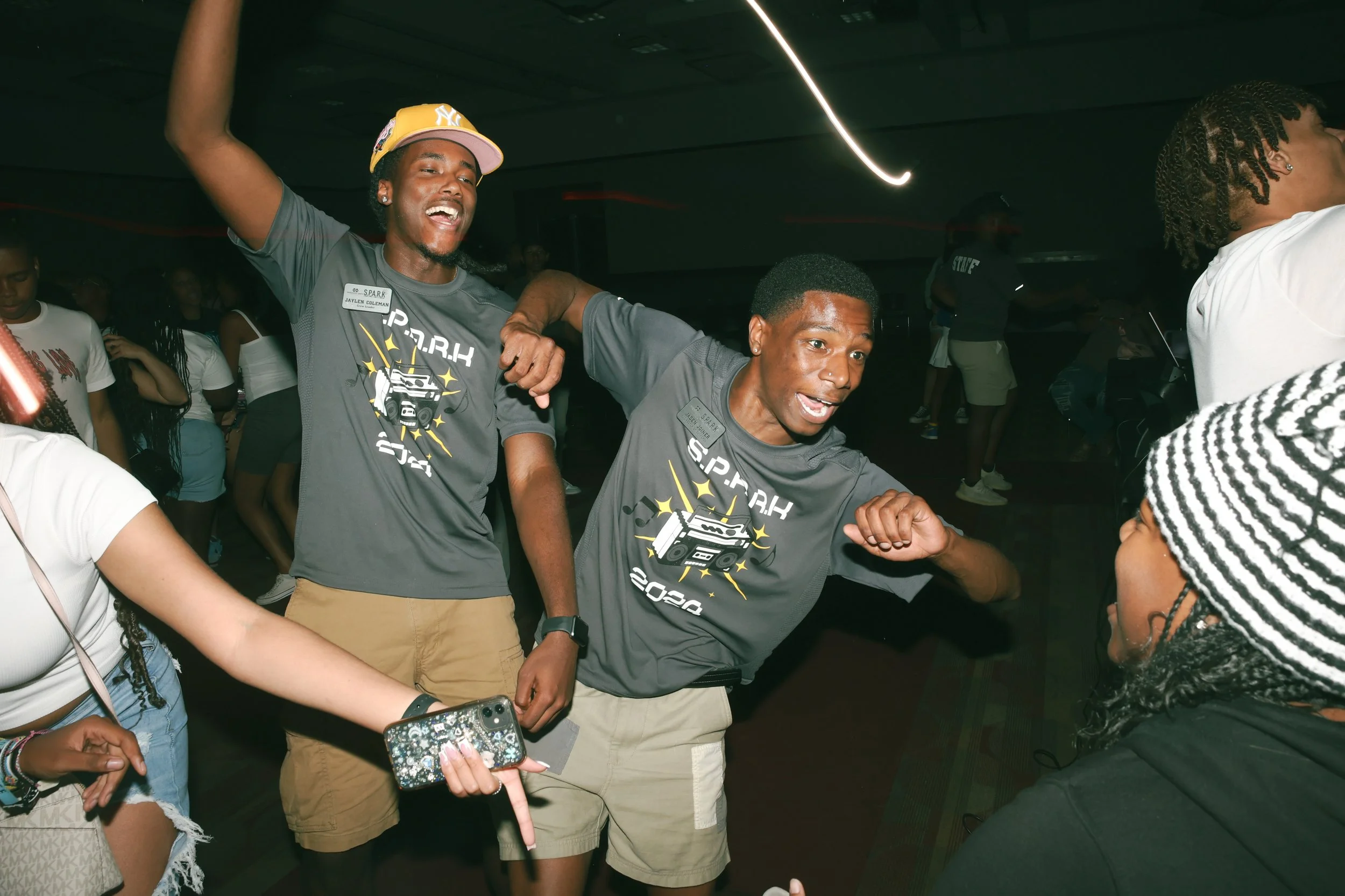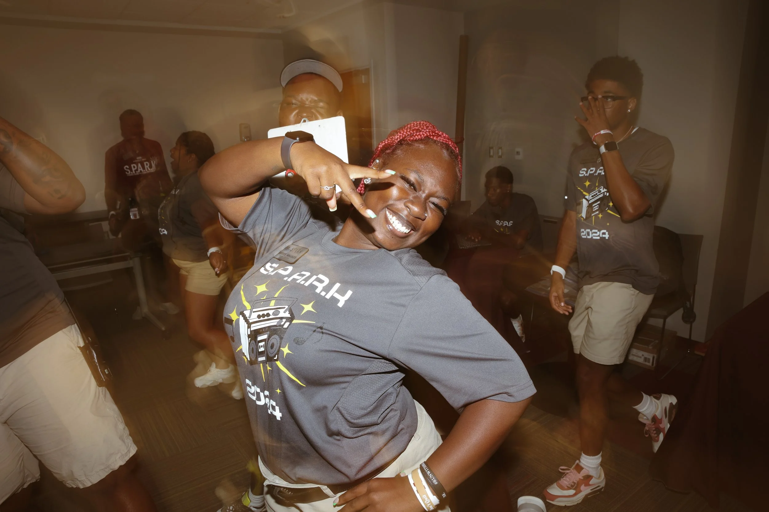 A group of young people at a lively indoor event, some wearing matching gray shirts with "S.P.A.R.H" printed on them. There is a woman smiling energetically in the foreground holding a phone. The background shows more people, some wearing backpacks.