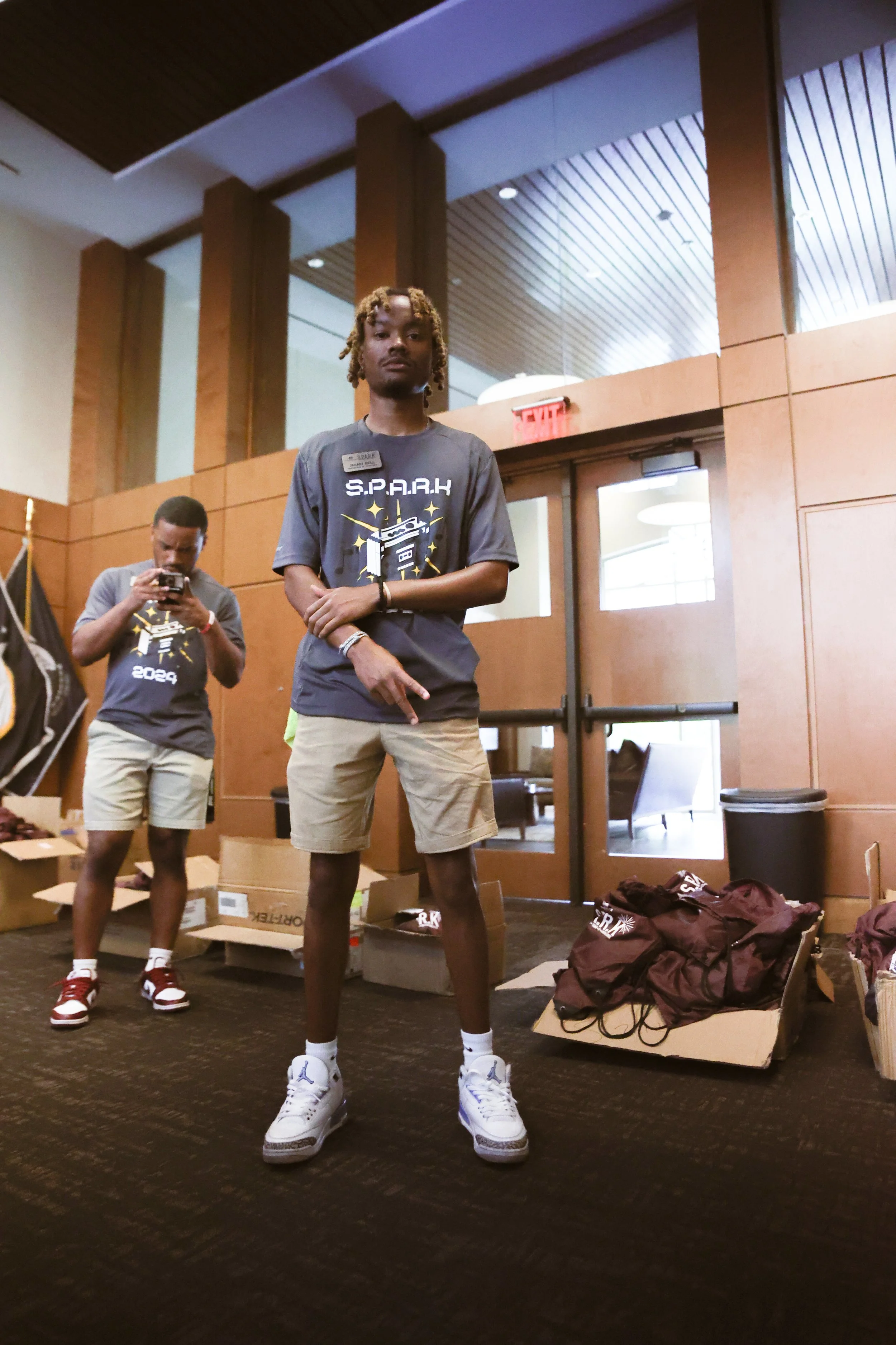 Two individuals in a room, both wearing matching t-shirts with "S.P.A.R.H" logo. One person is taking a photo with a smartphone, while the other poses with a casual gesture. The room contains open boxes and backpacks.