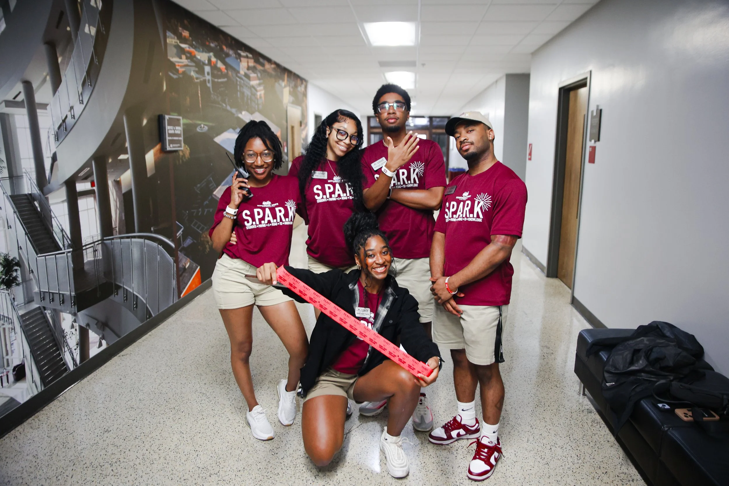 Group of five individuals in maroon S.P.A.R.K. shirts and khaki shorts posing in a hallway, with a background mural and a couch nearby.