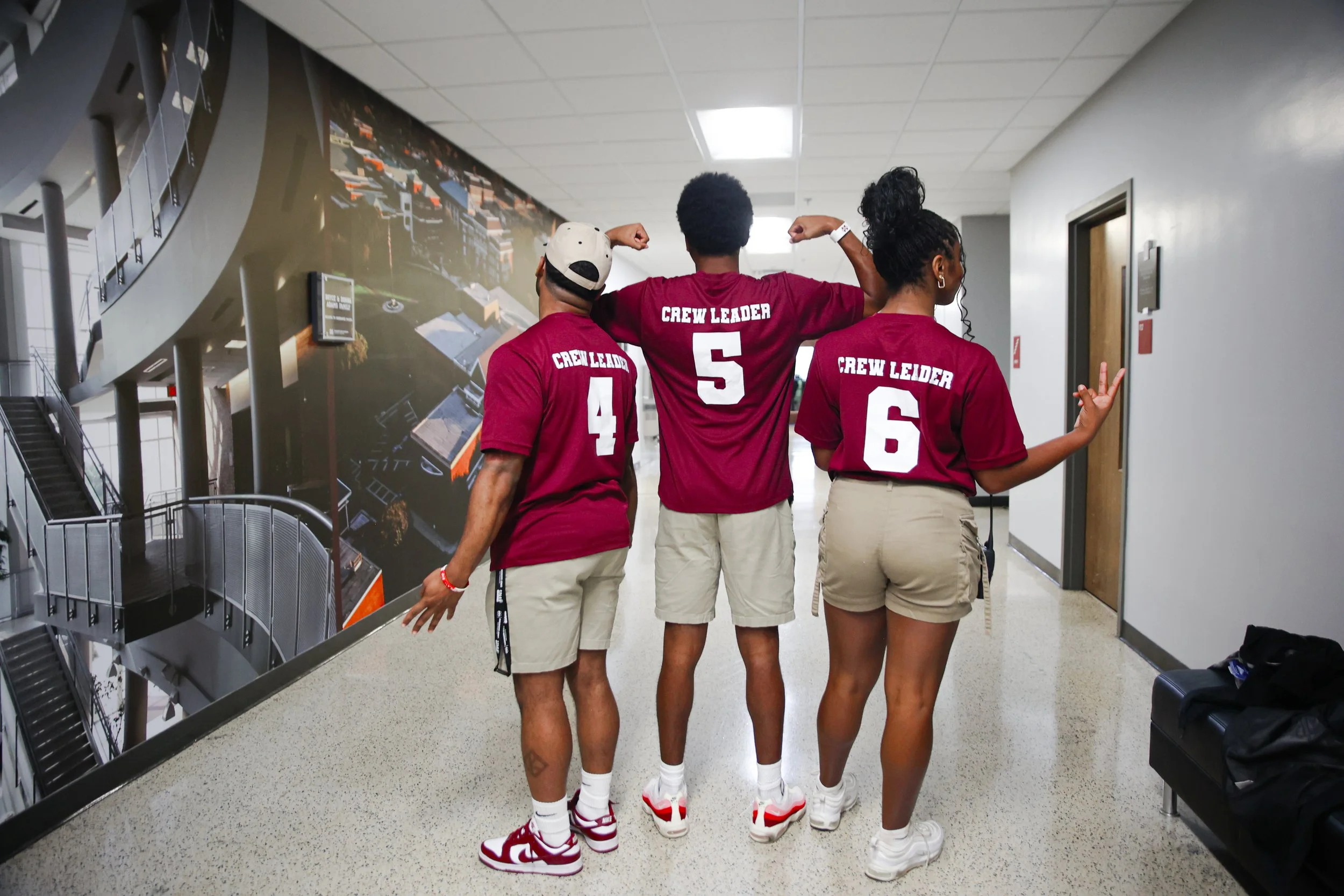 Three people wearing maroon shirts with "Crew Leader" and numbers 4, 5, 6 stand in a hallway with a mural.