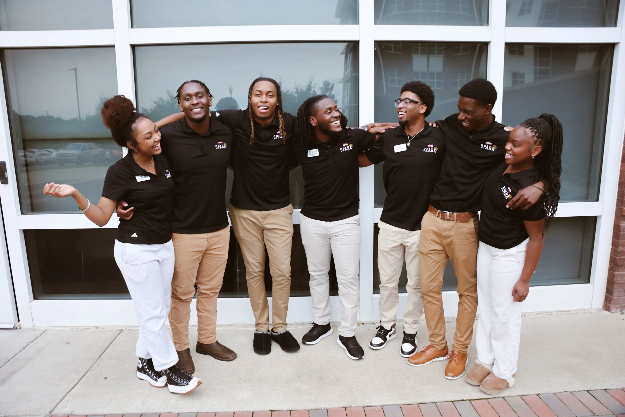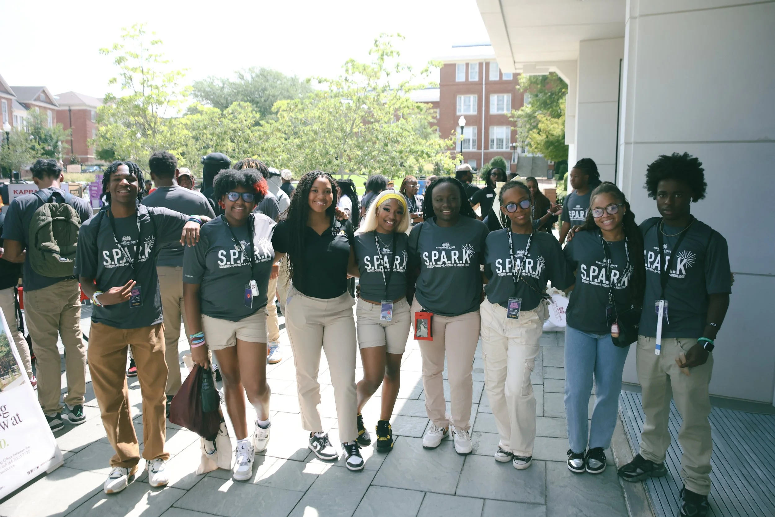 Group of young people wearing SPARK t-shirts posing outdoors with trees and buildings in the background.