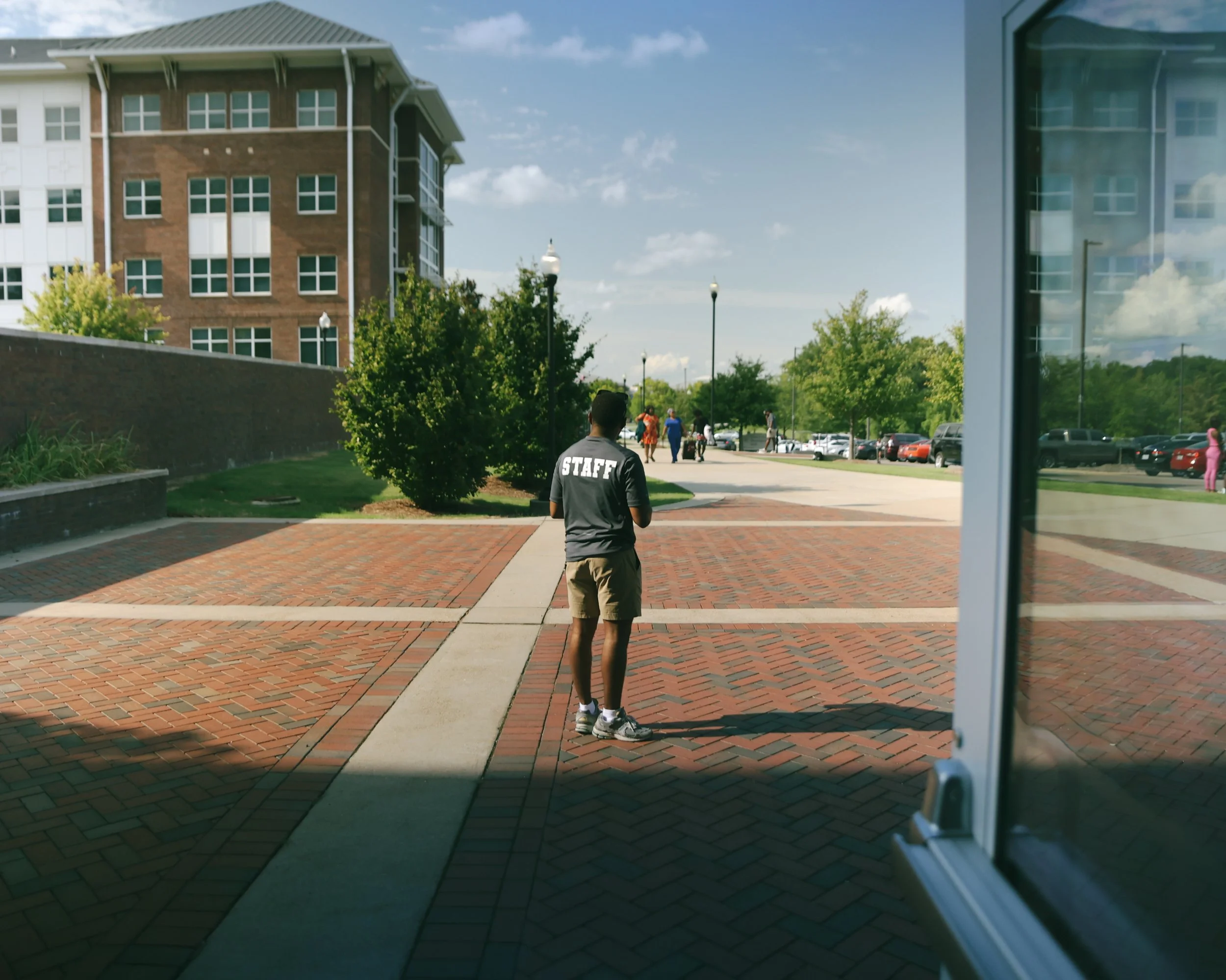 A person wearing a 'STAFF' t-shirt walks along a brick pathway near a multi-story building with large windows. The area is surrounded by trees and parked cars.