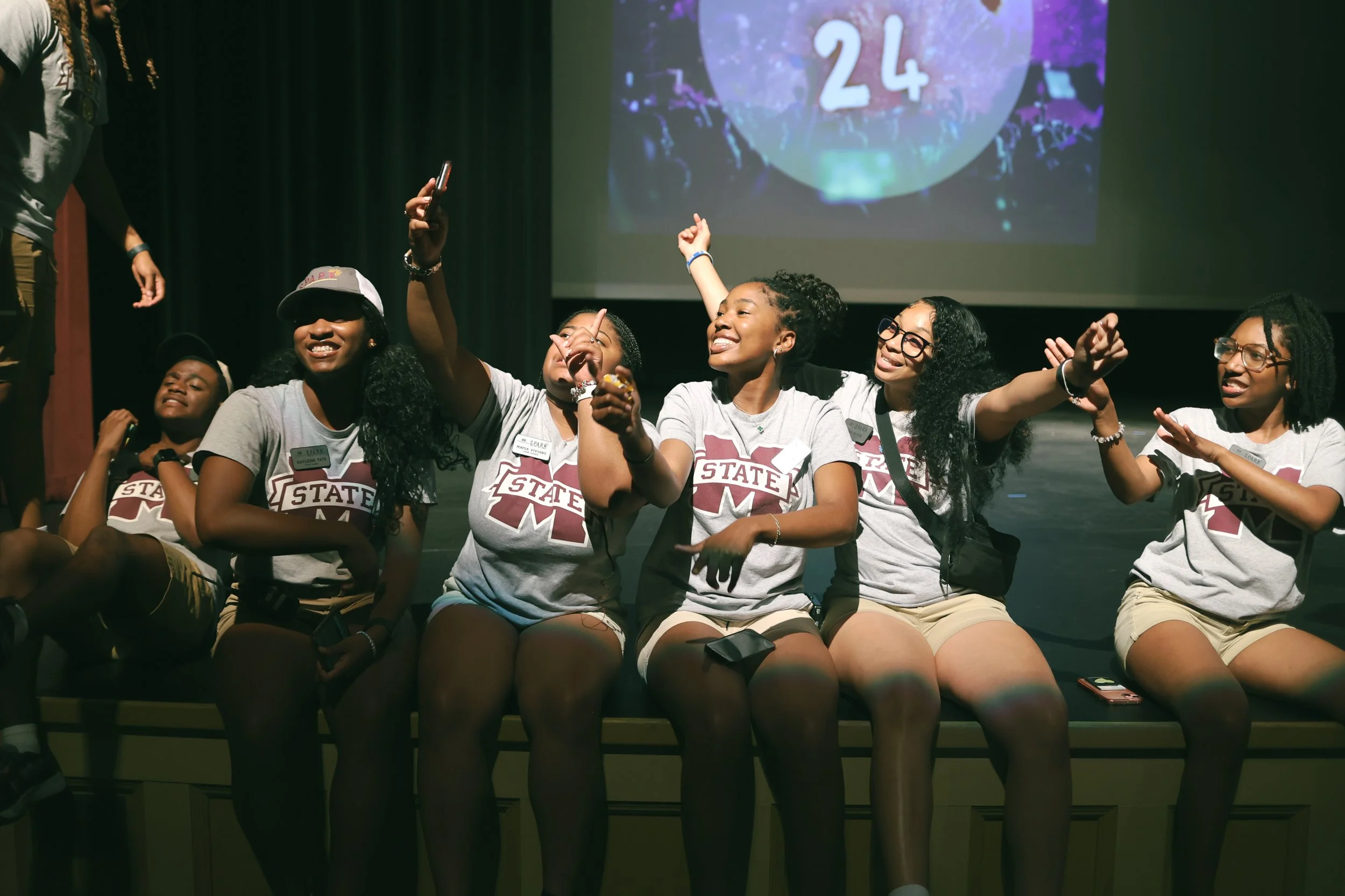 A group of young adults wearing matching State shirts sitting on a stage edge, taking a selfie and appearing to have fun, with a projection screen showing the number 24 in the background.