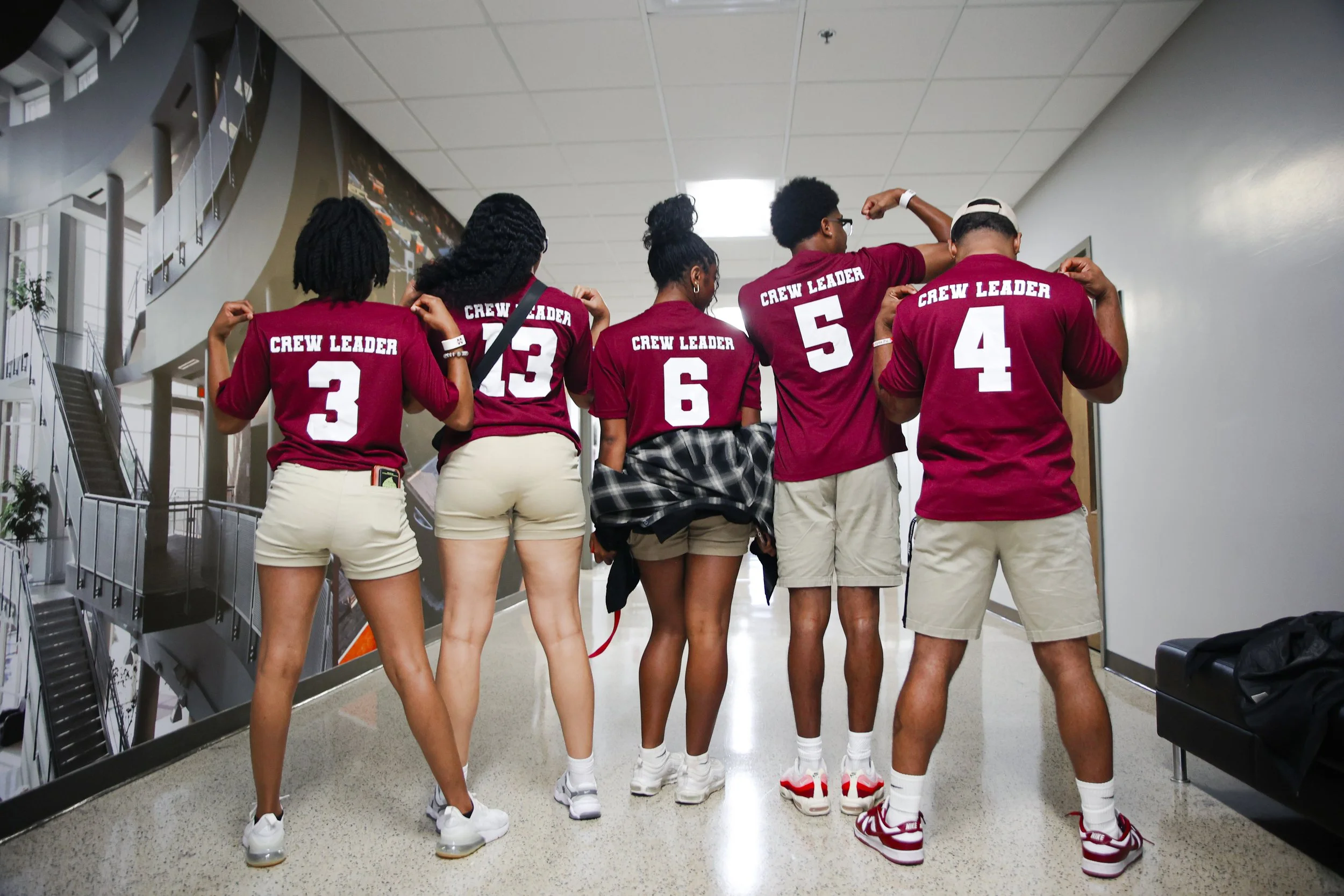 Group of five people wearing matching maroon shirts with "Crew Leader" and numbers on the back, posing in a hallway.