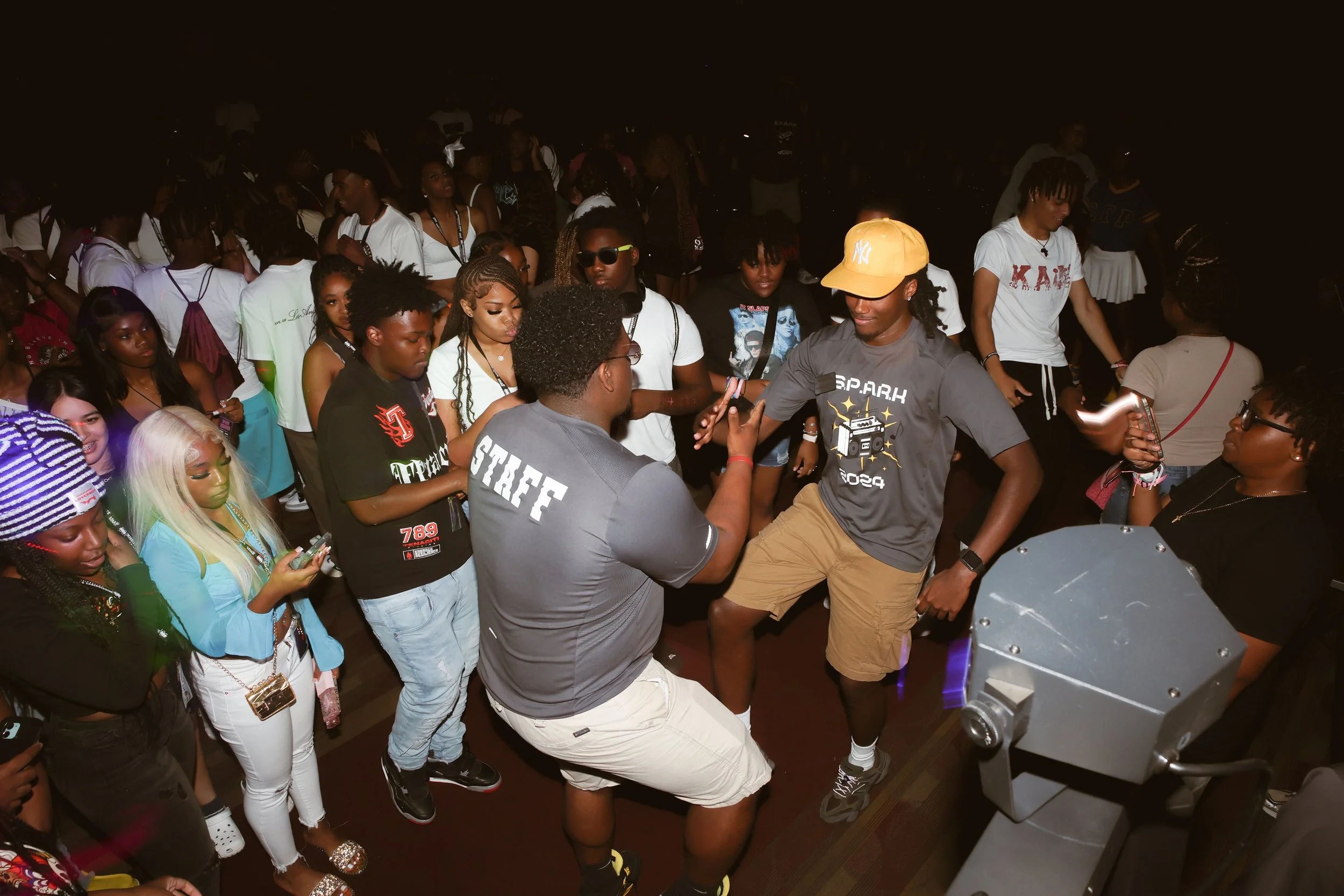 Group of young people dancing energetically at an indoor event, some wearing matching t-shirts, one holding a phone with a long exposure light trail effect.