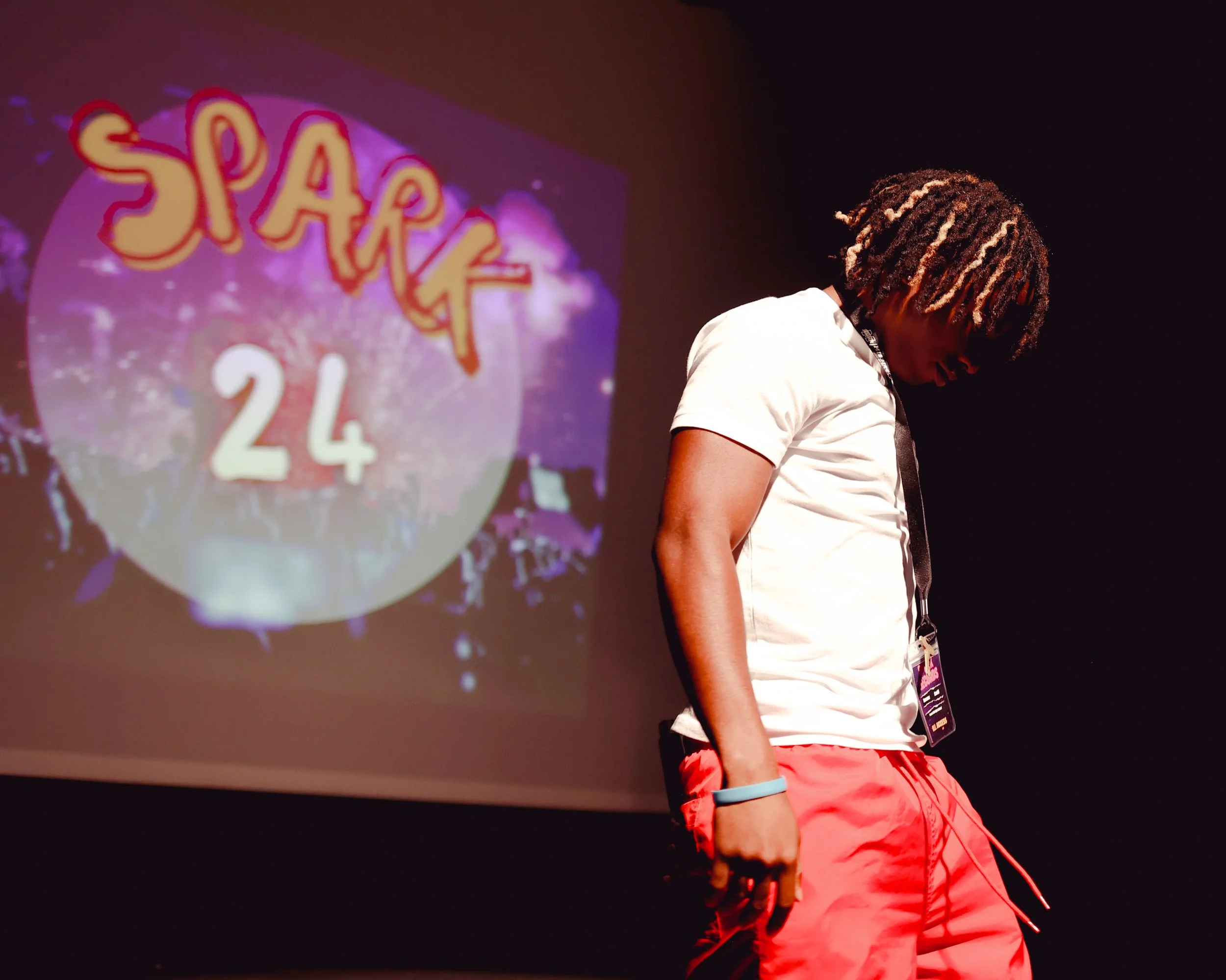 A dancer performing on stage with a vibrant projection in the background reading "SPARK 24." The dancer is wearing a gray t-shirt, black shorts, white sneakers, and a cap, striking a dynamic pose.